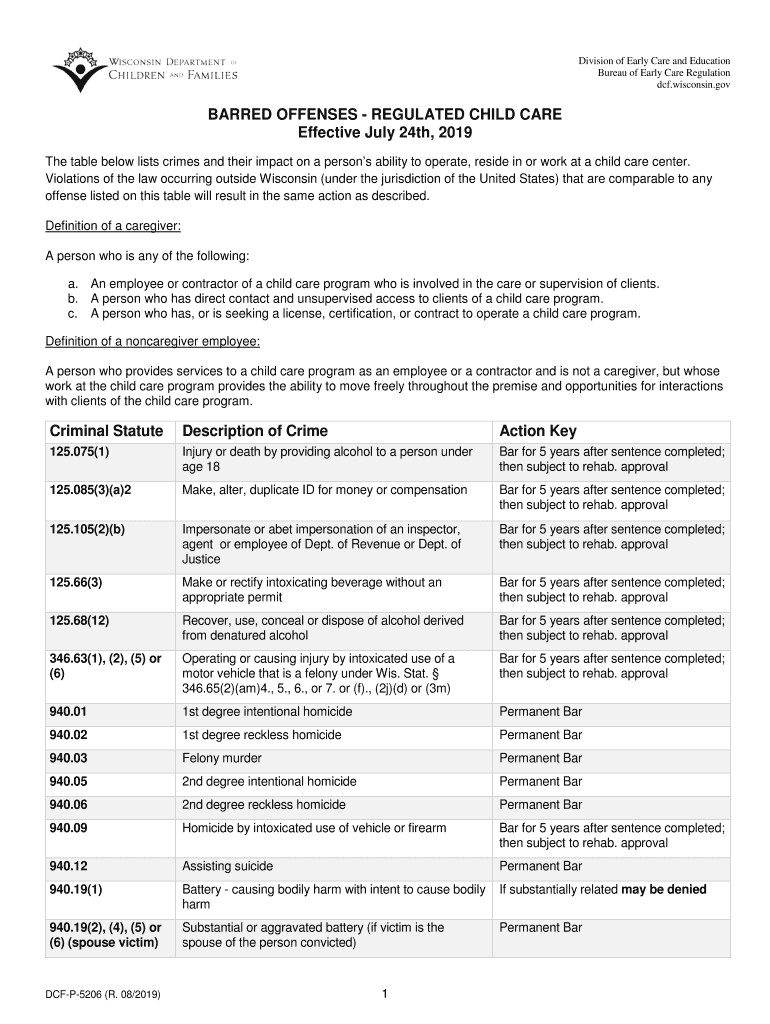 Get the free Barred Offenses - Regulated Child Care, DCF-P-5206. Child Care Regulation - dcf wisc...