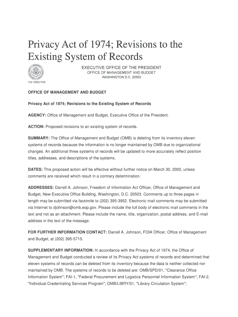 Existing System of RecordsOFFICE OF MANAGEMENT AND BUDGET