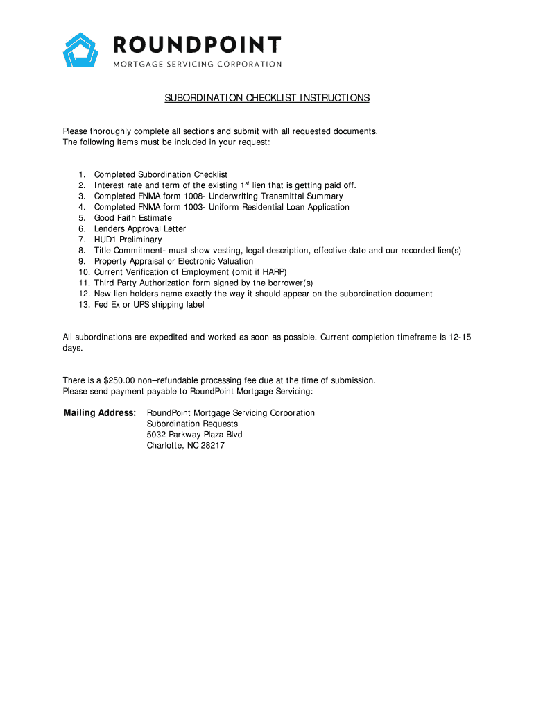 The Subordination Checklist Instructions is a real estate document used by borrowers and requestors to submit a subordination request to RoundPoint Mortgage Servicing.