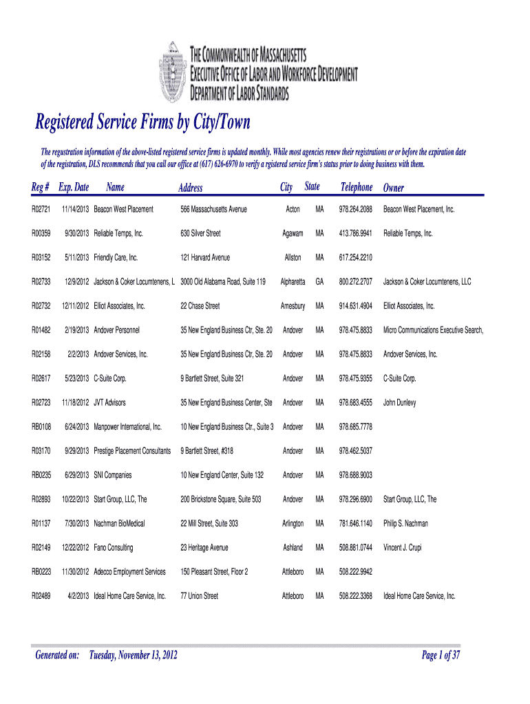 The registration information of the above listed registered service firms is updated monthly. While most agencies renew their registrations or before the expiration