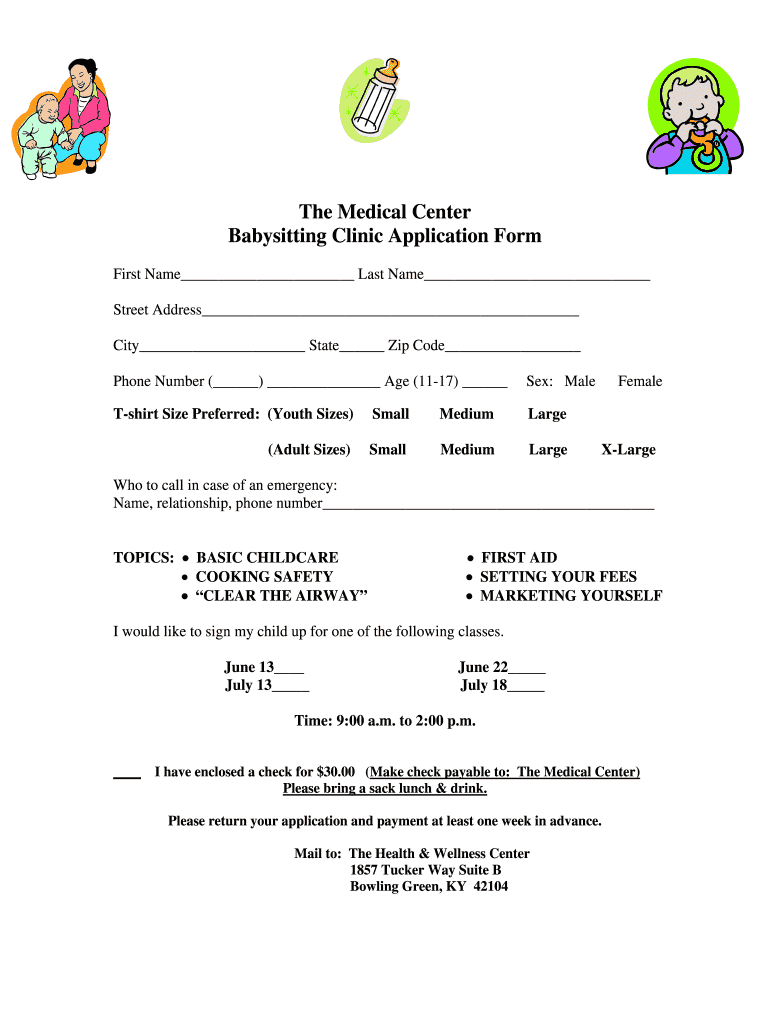 The Medical Center Babysitting Clinic Application Form First Name Last Name Street Address City State Zip Code Phone Number () Age (1117) Sex: Makeshift Size Preferred: (Youth Sizes)SmallMediumLarge(Adult