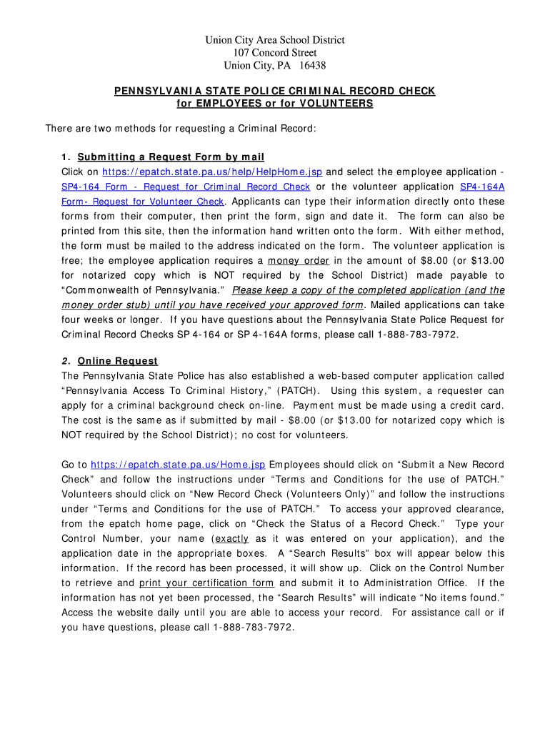 Union City Area School District 107 Concord Street Union City, PA 16438 PENNSYLVANIA STATE POLICE CRIMINAL RECORD CHECK for EMPLOYEES or for VOLUNTEERS There are two methods for requesting a Criminal