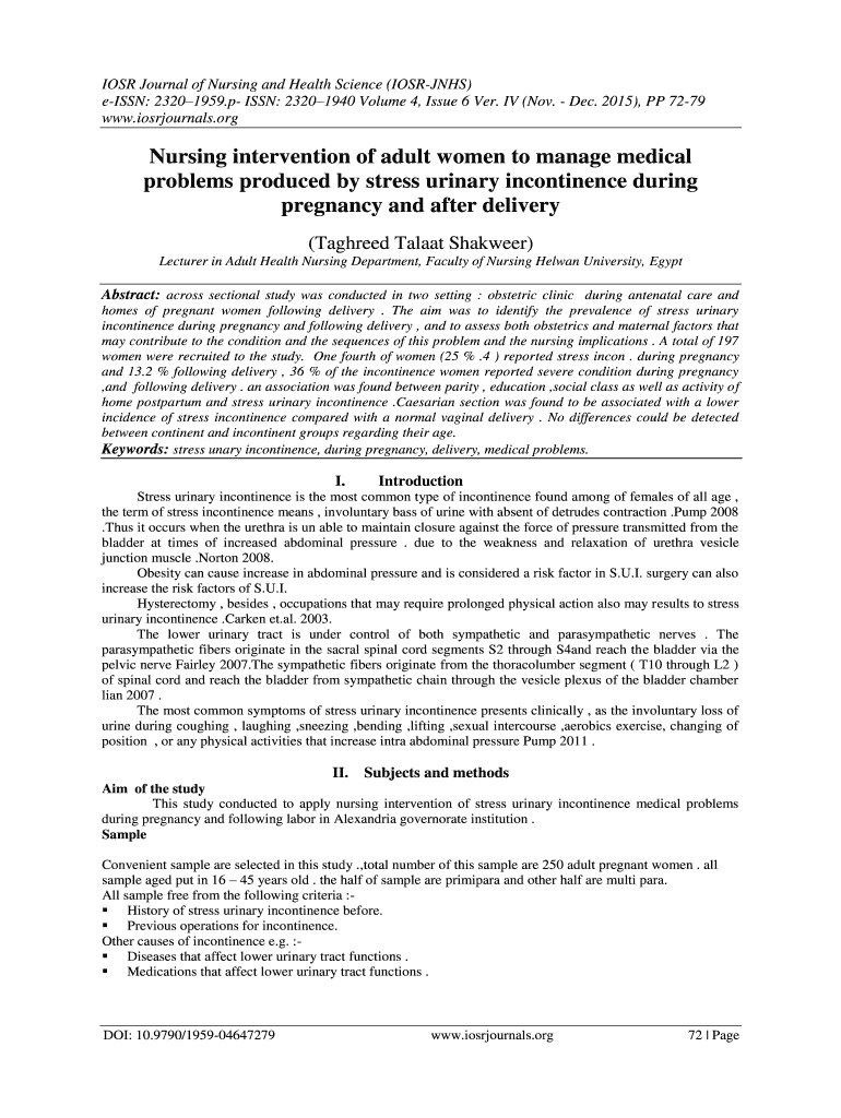 IOR Journal of Nursing and Health Science (IOSRJNHS) ISSN: 23201959.p ISSN: 23201940 Volume 4, Issue 6 Very. IV (Nov. Dec. 2015), PP 7279 www.iosrjournals.orgNursing intervention of adult women to