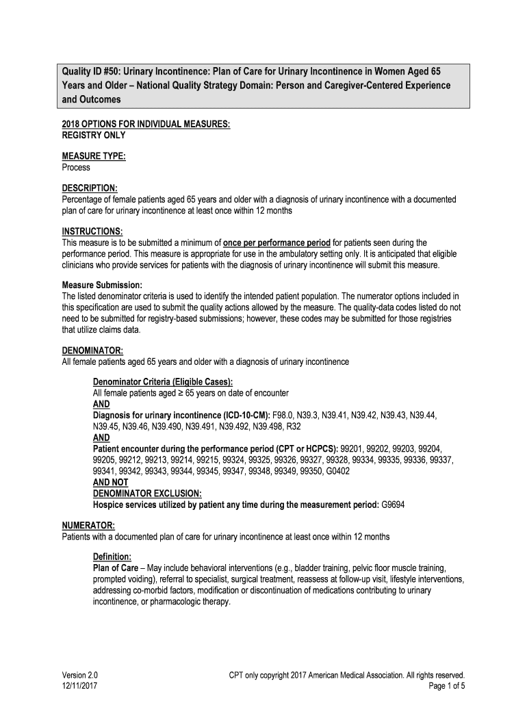 Quality ID #50: Urinary Incontinence: Plan of Care for Urinary Incontinence in Women Aged 65 Years and Older National Quality Strategy Domain: Person and CaregiverCentered Experience and Outcomes