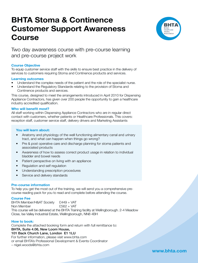 BETA Stoma & Continence Customer Support Awareness Course Two day awareness course with recourse learning and recourse project work Course Objective To equip customer service staff with the skills