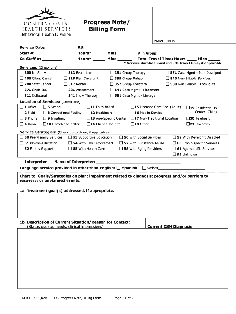 Progress Note/ Billing Form Behavioral Health Division NAME / MAN Service Date: RU: Staff #: Hours* Mins # in Group: Co-Staff #: Hours* Mins Total Travel Time: Hours Mins * Service duration must include
