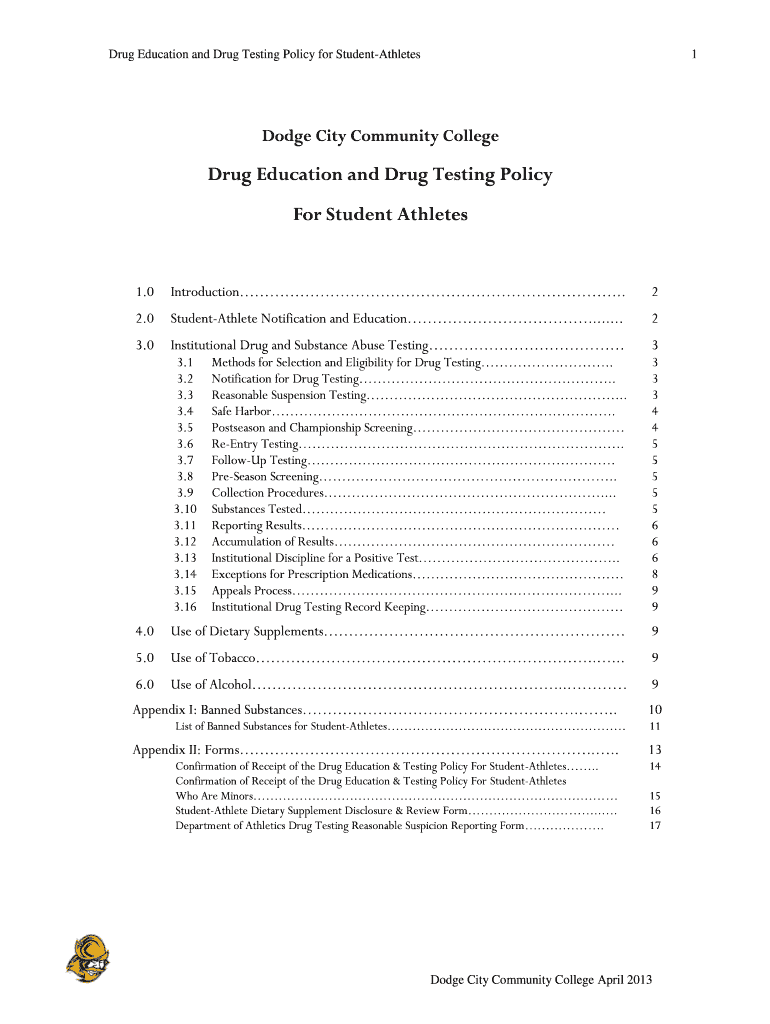 Drug Education and Drug Testing Policy for StudentAthletes1Dodge City Community CollegeDrug Education and Drug Testing Policy