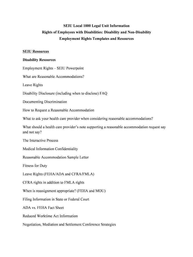 SEU Local 1000 Legal Unit Information Rights of Employees with Disabilities: Disability and Disability Employment Rights Templates and Resources SEU Resources Disability Resources Employment Rights