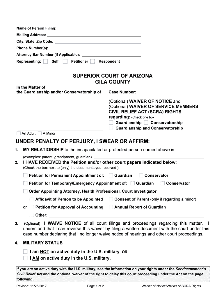 Name of Person Filing: Mailing Address: City, State, Zip Code: Phone Number(s): Attorney Bar Number (if Applicable): Representing:SelfPetitionerRespondentSUPERIOR COURT OF ARIZONA GILA COUNTY In the