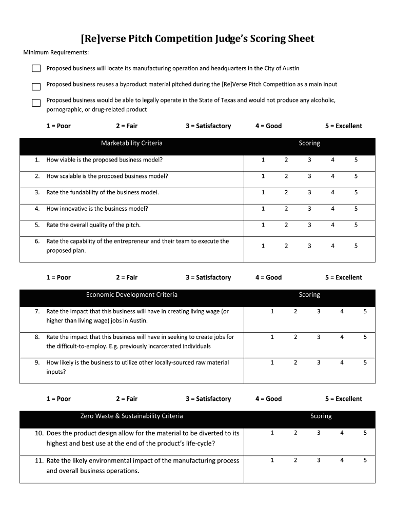 Re verse Pitch Competition Judges Scoring SheetMinimumRequirements:ProposedbusinesswilllocateitsmanufacturingoperationandheadquartersintheCityofAustin Proposedbusinessreusesabyproductmaterialpitchedduringthe