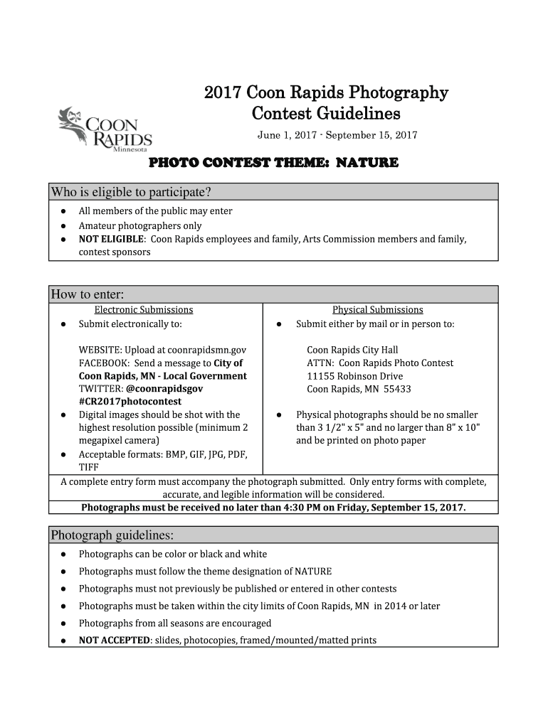 2017 Coon Rapids Photography Contest Guidelines June 1, 2017, September 15, 2017PHOTO CONTEST THEME: NATURE Who is eligible to participate? All members of the public may enter Amateur photographers