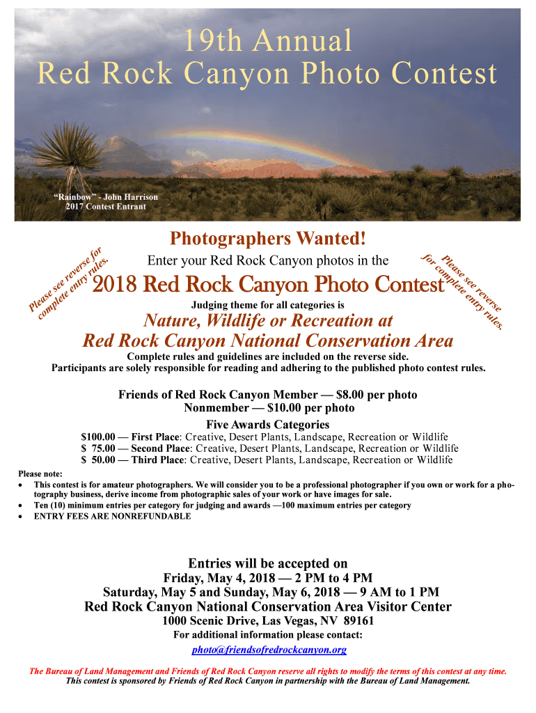 19th Annual Red Rock Canyon Photo ContestRainbow John Harrison 2017 Contest EntrantPhotographers Wanted! Enter your Red Rock Canyon photos in the2018 Red Rock Canyon Photo Contest Judging theme for