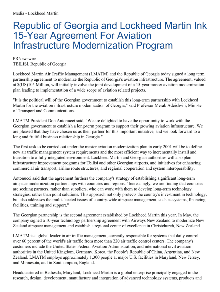 Media Lockheed MartinRepublic of Georgia and Lockheed Martin Ink 15Year Agreement For Aviation Infrastructure Modernization Program PRNewswire TBILISI, Republic of Georgia Lockheed Martin Air Traffic