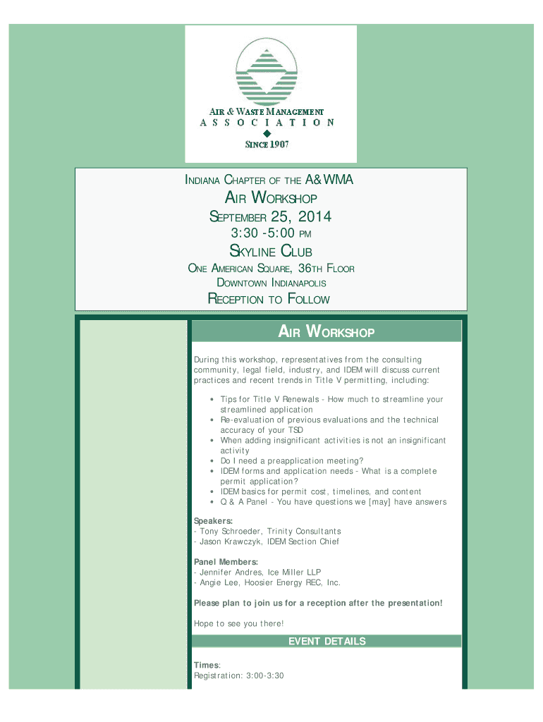 Indiana CHAPTER THEA&WMAAiR WORKSHOPSEPTEmBER 25, 2014 3:30 5:00 Skyline CLUB ONE American SQUARE, 36TH FLOOR DOwNTOwN INDiANAPOLiSREcEPTiONTOFOLLOwAIR WORKSHOP During this workshop, representatives