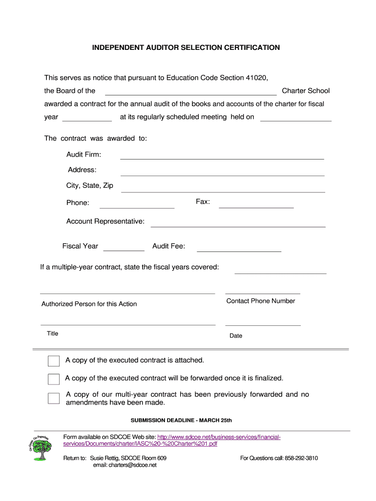 INDEPENDENT AUDITOR SELECTION CERTIFICATION This serves as notice that pursuant to Education Code Section 41020, the Board of the Charter School awarded a contract for the annual audit of the books