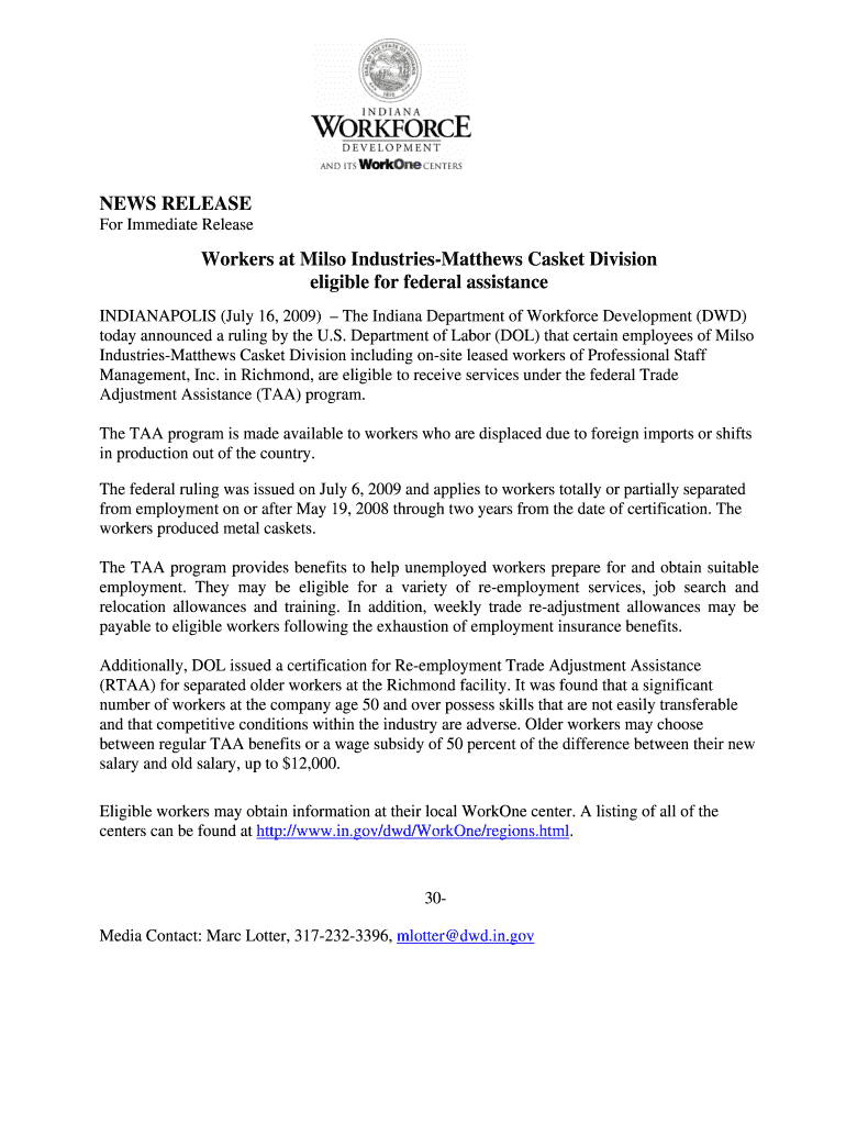 NEWS RELEASE For Immediate ReleaseWorkers at Milo Industries Matthews Casket Division eligible for federal assistance INDIANAPOLIS (July 16, 2009) The Indiana Department of Workforce Development (DID)