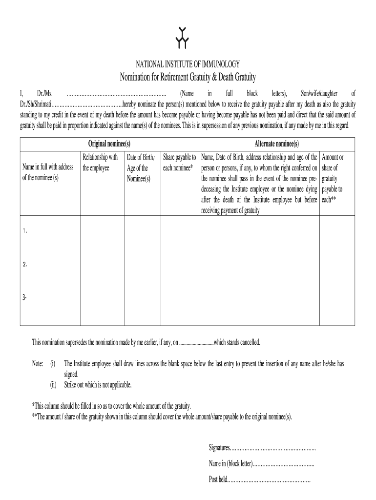 NATIONAL INSTITUTE OF IMMUNOLOGYNomination for Retirement Gratuity & Death Gratuity I, Dr./Ms. (Name in full block letters), Son/wife/daughter of Dr./Sh/Shrimp.hereby nominate the person(s) mentioned