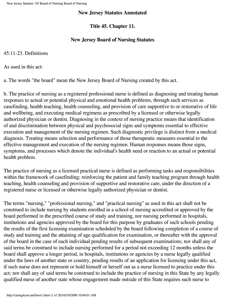New Jersey Statutes NJ Board of Nursing Board of Nursing Jersey Statutes Annotated Title 45. Chapter 11. New Jersey Board of Nursing Statutes 45:1123. Definitions As used in this act: a. The words