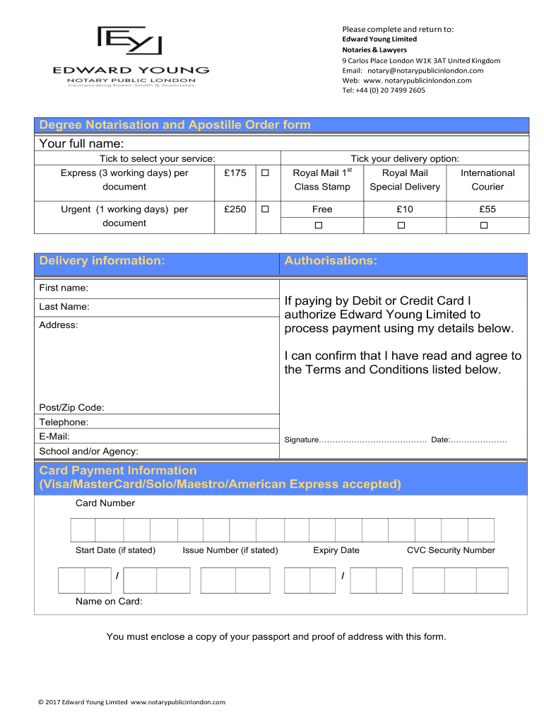 Please complete and return to:Edward Young Limited Notaries & Lawyers9 Carlos Place London W1K 3AT United Kingdom Email:notary notarypublicinlondon.com Web:WWW. Notarypublicinlondon.compel: +44 (0)