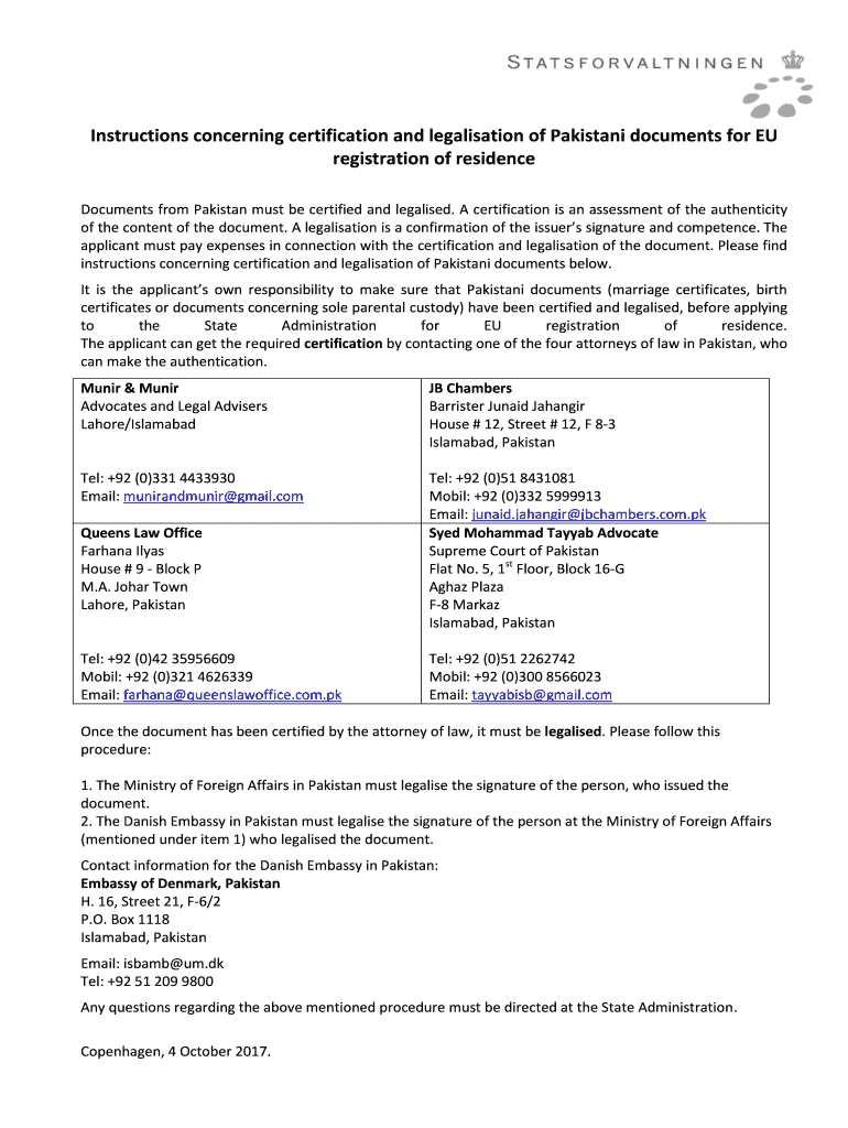 Instructions concerning certification and legalization of Pakistani documents for EU