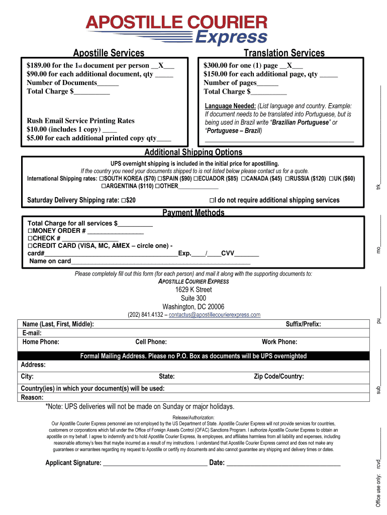 Translation Services×189.00 for the 1st document per person X ×90.00 for each additional document, qty Number of Documents Total Charge $ $300.00 for one (1) page X ×150.00 for each additional