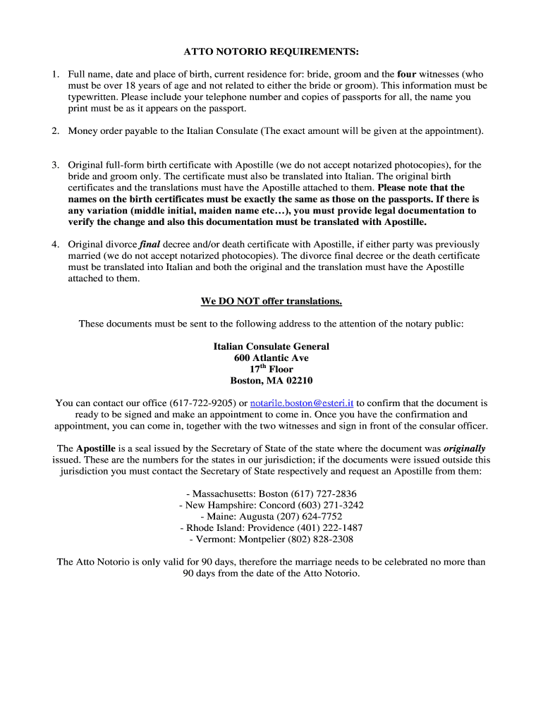 Atto notorio requirements may include personal information, declarations of facts, and signatures.