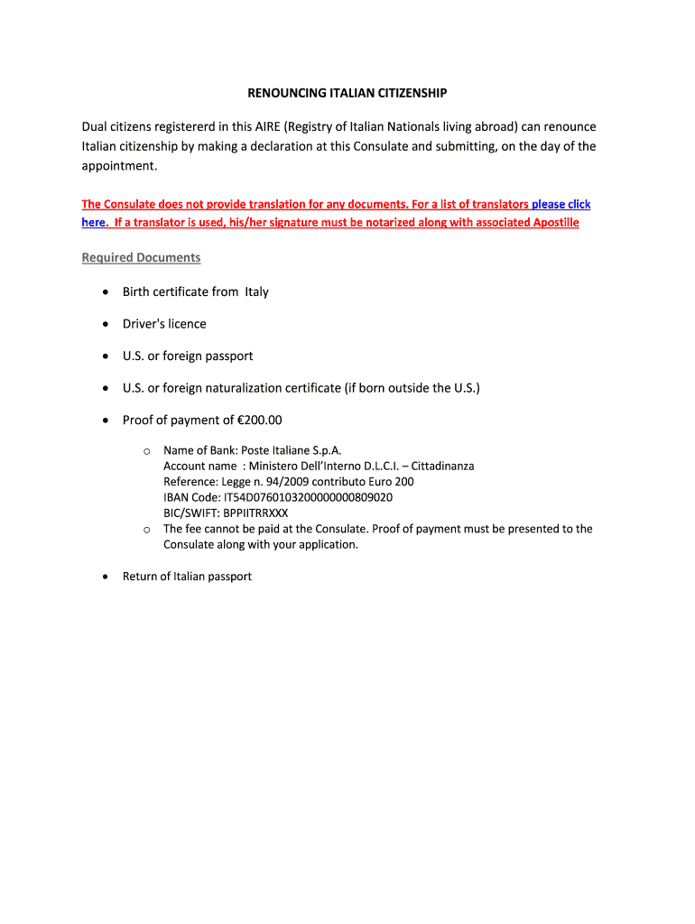 Any individual who wishes to voluntarily renounce their Italian citizenship must file for renunciation.