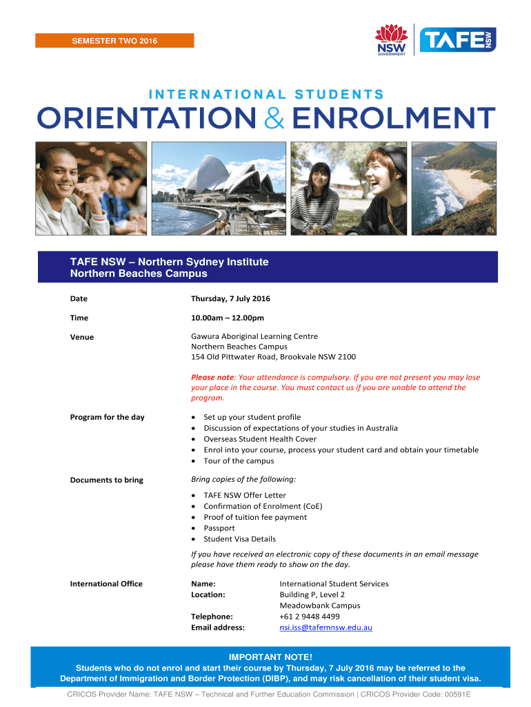 SEMESTER TWO 2016TAFE NSW Northern Sydney Institute Northern Beaches Campus Date Thursday, 7 July 2016Time10.00am 12.00pmVenueGawura Aboriginal Learning Center Northern Beaches Campus 154 Old Pitt