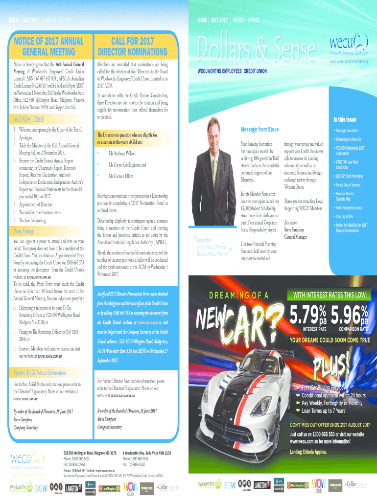 ISSUE JULY 2017 WINTER SPRINGIEST JULY 2017NOTICE OF 2017 ANNUAL GENERAL MEETINGCALL FOR 2017 DIRECTOR NOMINATIONSNotice is hereby given that the 46th Annual General Meeting of Woolworths Employees