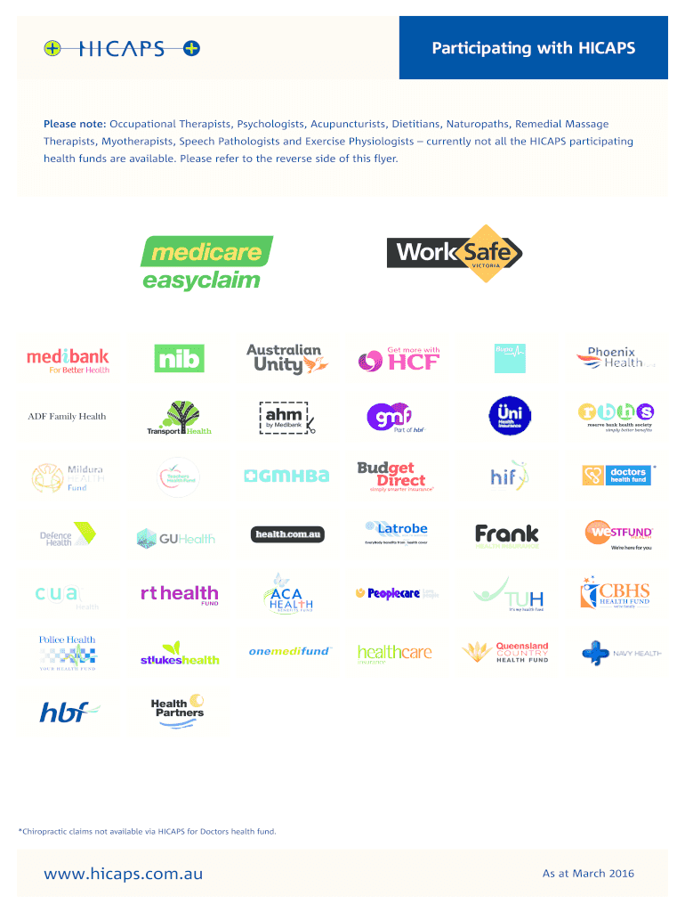 Participating with HICAPSPlease note: Occupational Therapists, Psychologists, Acupuncturists, Dietitians, Naturopaths, Remedial Massage Therapists, Therapists, Speech Pathologists and Exercise Physiologists