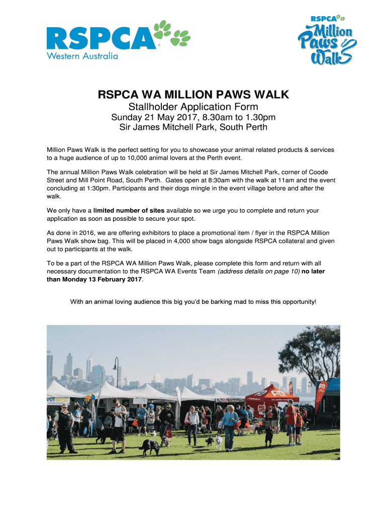 ASPCA WA MILLION PAWS WALK Stallholder Application Form Sunday 21 May 2017, 8.30am to 1.30pm Sir James Mitchell Park, South Perth A Million Paws Walk is the perfect setting for you to showcase your