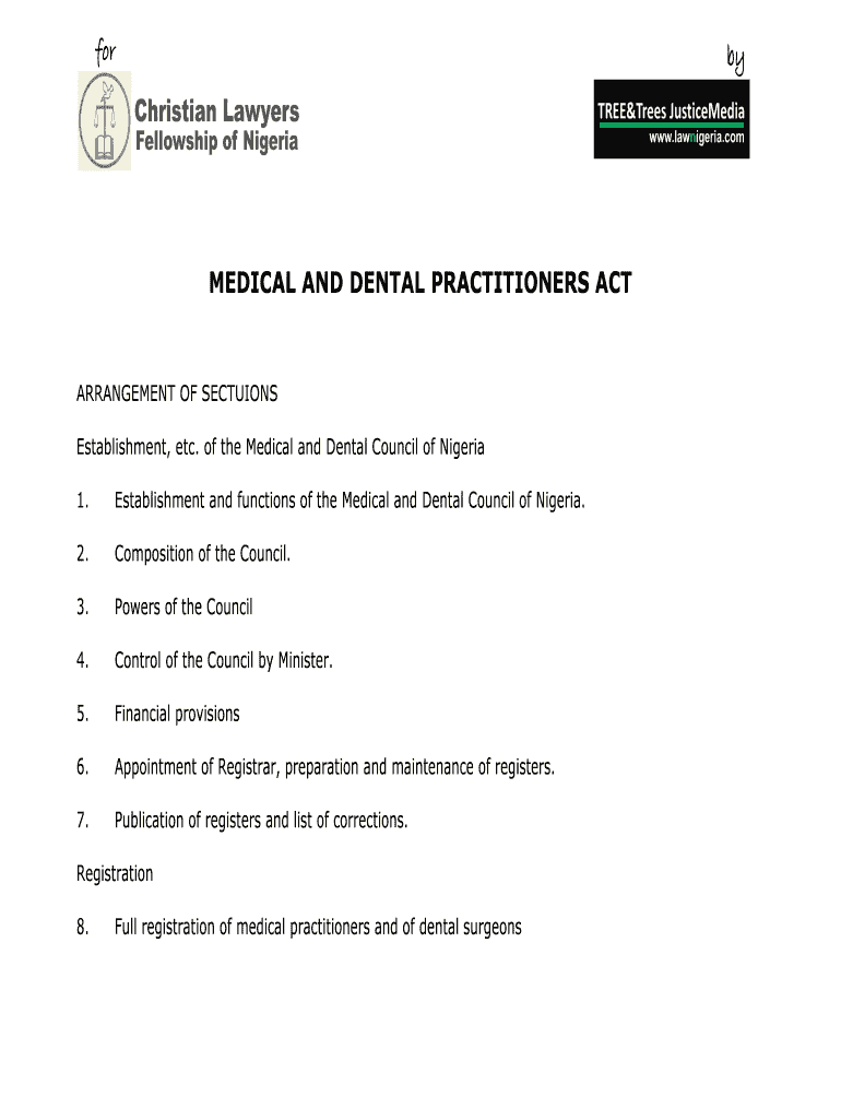 1. Establishment and functions of the Medical and Dental Council of Nigeria.2.