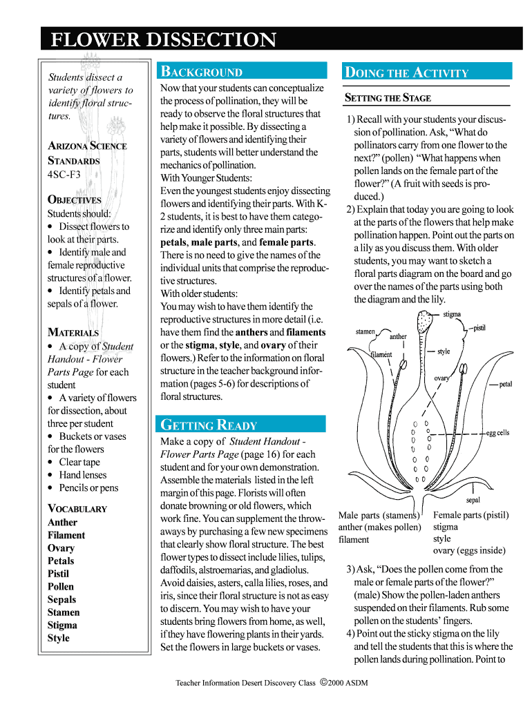 FLOWER DISSECTION Students dissect a variety of flowers to identify floral structures. ARIZONA SCIENCE STANDARDS 4SCF3OBJECTIVES Students should: Dissect flowers to look at their parts. Identify male