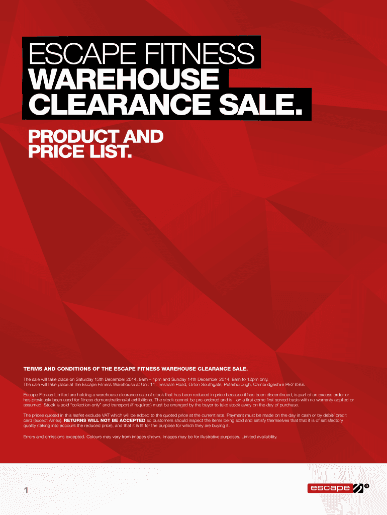 ESCAPE FITNESS WAREHOUSE CLEARANCE SALE. PRODUCT AND PRICE LIST.TERMS AND CONDITIONS OF THE ESCAPE FITNESS WAREHOUSE CLEARANCE SALE. The sale will take place on Saturday 13th December 2014, 9am 4pm