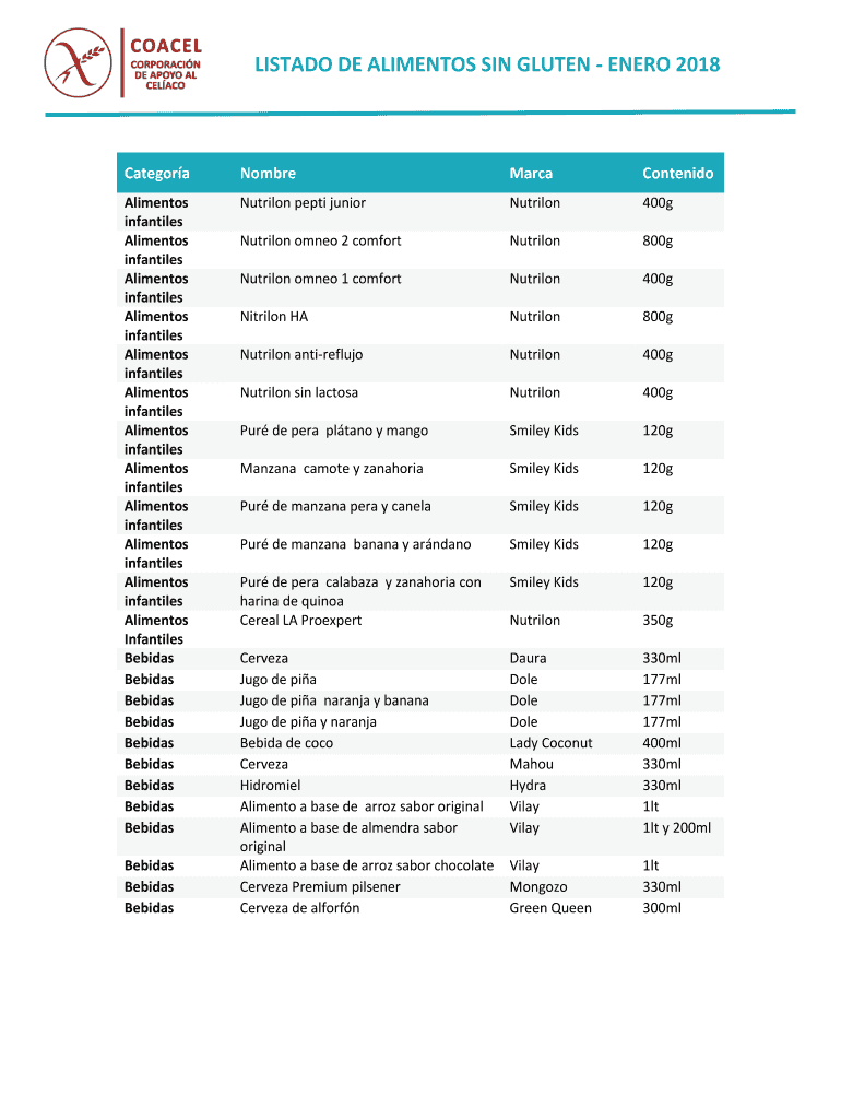 LISTED DE ALIMENTS SIN GLUTEN NERO 2018CategoraNombreMarcaContenidoAlimentos infantile Aliments Infantile Besides BebidasNutrilon Pepsi juniorNutrilon400gNutrilon one 2 comfortNutrilon800gNutrilon