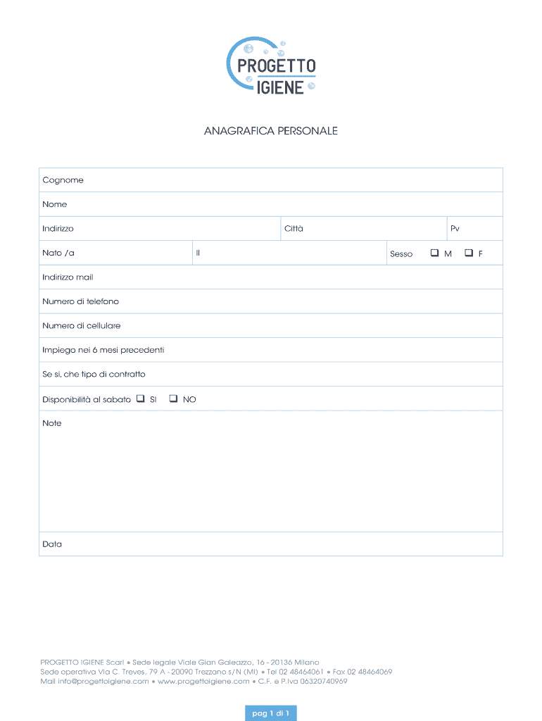ANAGRAFICA PERSONALECognome Nome IndirizzoCittNato /Alps SessoIndirizzo mail Number DI telephone Number DI cellular Impair Na 6 mesh precedent Se is, Che tip DI contralto Disponibilit all sabatoqSIqNONoteDataPROGETTO