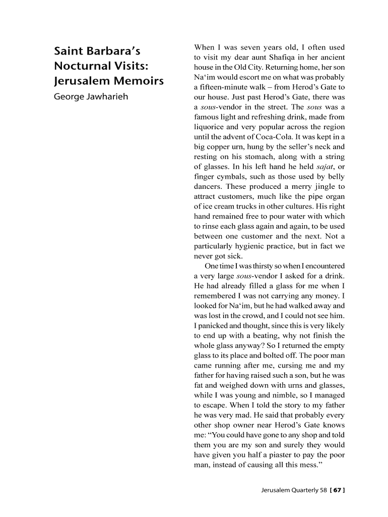Saint Barbara's Nocturnal Visits: Jerusalem Memoirs George JawhariehWhen I was seven years old, I often used to visit my dear aunt Shafiq in her ancient house in the Old City. Returning home, her