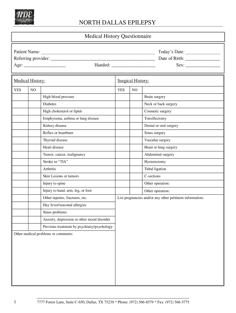 NORTH DALLAS EPILEPSY Medical History Questionnaire Patient Name: Today's Date: Referring provider: Date of Birth: Age: Handed: Sex: Medical History:Surgical History:YESYESNONOHigh blood pressure