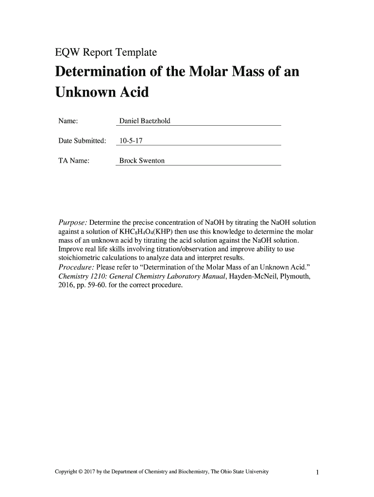 ECW Report TemplateDetermination of the Molar Mass of an