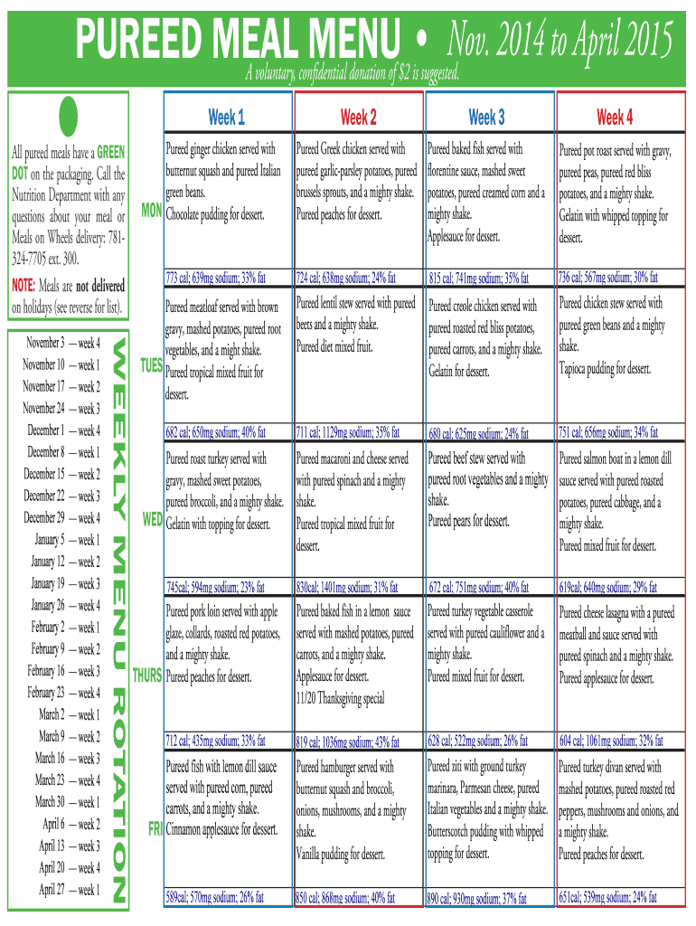 Nov. 2014 to April 2015 Puréed MEAL MENU November April A voluntary, confidential donation of $2 is suggested. Week 1 All puréed meals have a GREEN DOT on the packaging. Call the Nutrition Department