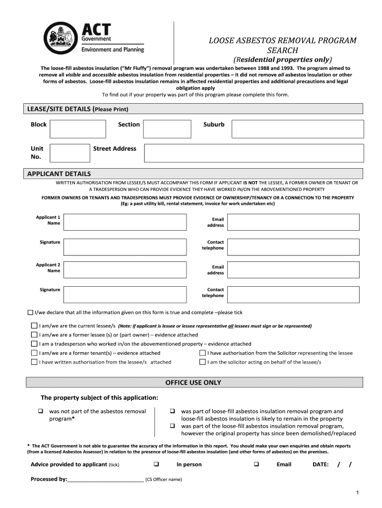 LOOSE ASBESTOS REMOVAL PROGRAM SEARCH (Residential properties only)The loose fill asbestos insulation (Mr Fluffy) removal program was undertaken between 1988 and 1993. The program aimed to remove