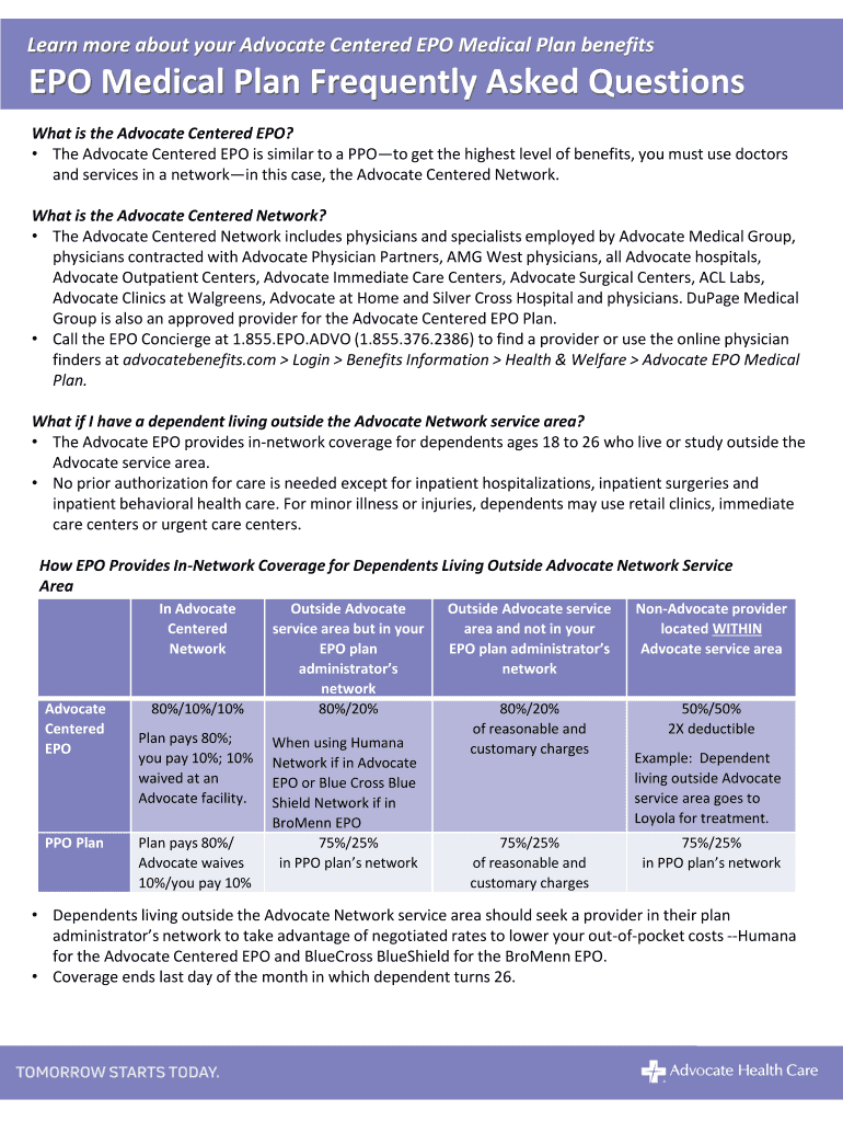 Learn more about your Advocate Centered EPO Medical Plan benefits EPO Medical Plan Frequently Asked Questions What is the Advocate Centered EPO? The Advocate Centered EPO is similar to a Photo get
