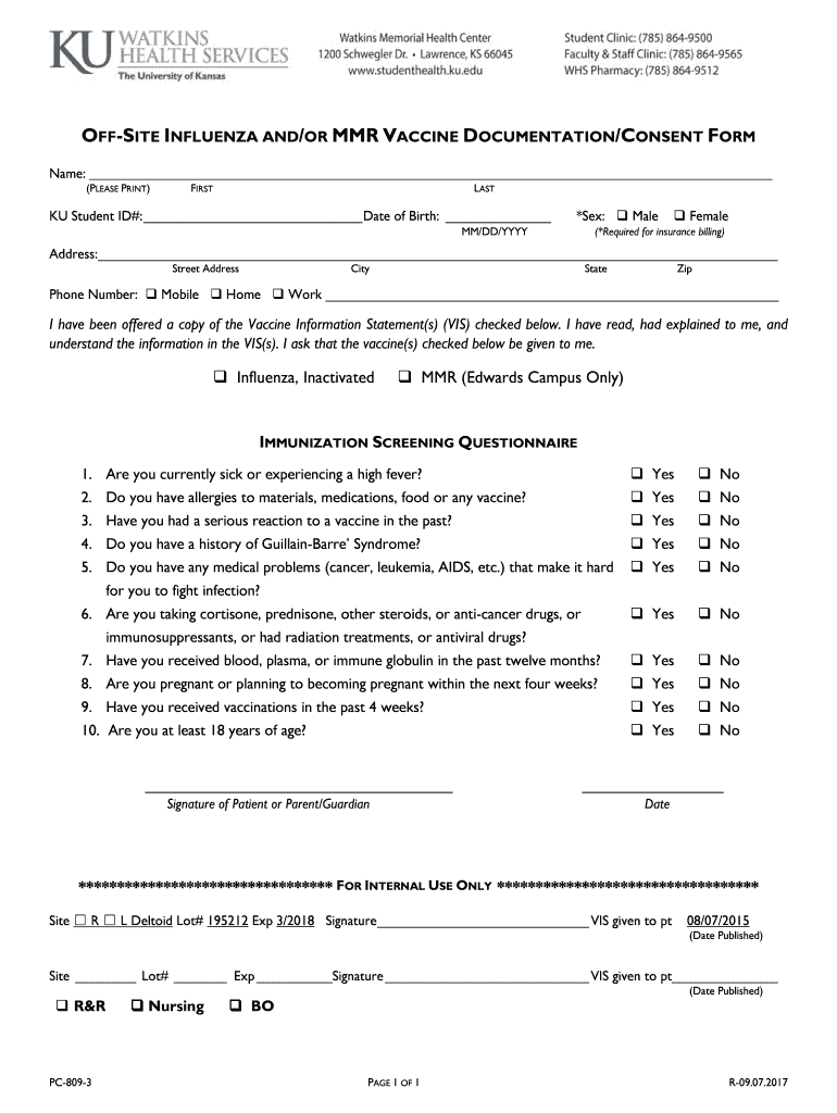 OFFSITE INFLUENZA AND/OR MMR VACCINE DOCUMENTATION/CONSENT FORM Name: (PLEASE PRINT)FIRSTLASTKU Student ID#: Date of Birth: *Sex: Male MM/DD/YYY Female(*Required for insurance billing)Address: Street