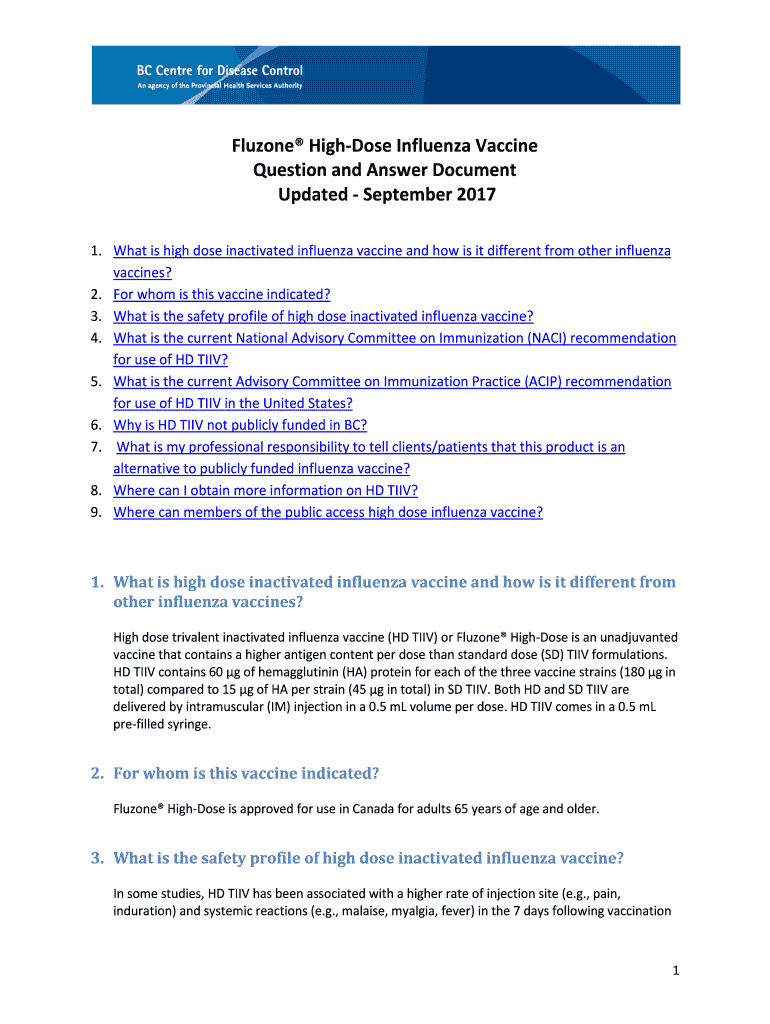 Flu zones The Highest Influenza Vaccine Question and Answer Document Updated September 2017 1. What is high dose inactivated influenza vaccine, and how is it different from other influenza vaccines?