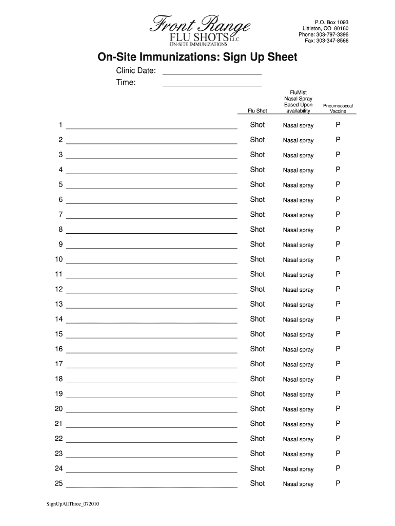 P.O. Box 1093 Littleton, CO 80160 Phone: 3037973396 Fax: 3033478566OnSite Immunizations: Sign Up Sheet Clinic Date: Time: Flu ShotFluMist Nasal Spray Based Upon availabilityPneumococcal Vaccine1ShotNasal