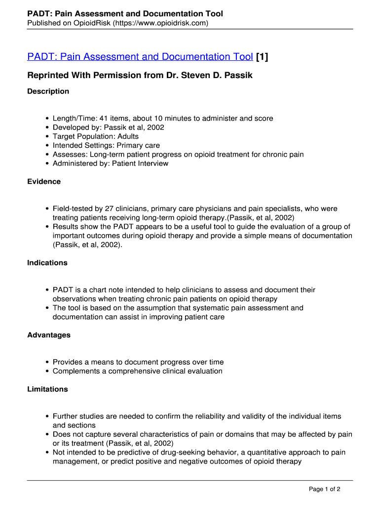 PART: Pain Assessment and Documentation Tool Published on Opioids (https://www.opioidrisk.com)PART: Pain Assessment and Documentation Tool 1 Reprinted With Permission from Dr. Steven D. Passim DescriptionLength/Time: