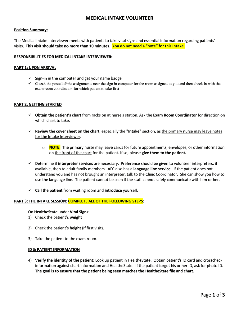 MEDICAL INTAKE VOLUNTEER Position Summary: The Medical Intake Interviewer meets with patients to take vital signs and essential information regarding patients visits. This visit should take no more