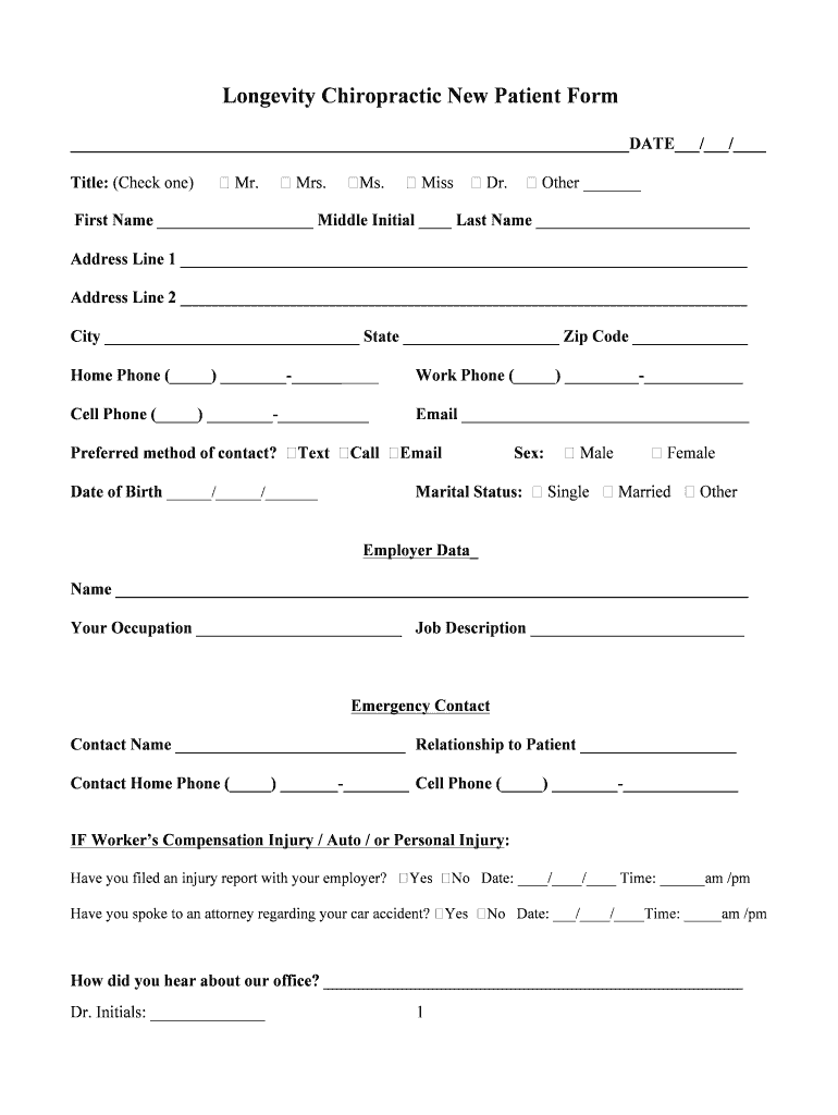 The Longevity Chiropractic New Patient Form is a healthcare document used by chiropractic offices to collect essential medical and personal information from new patients.