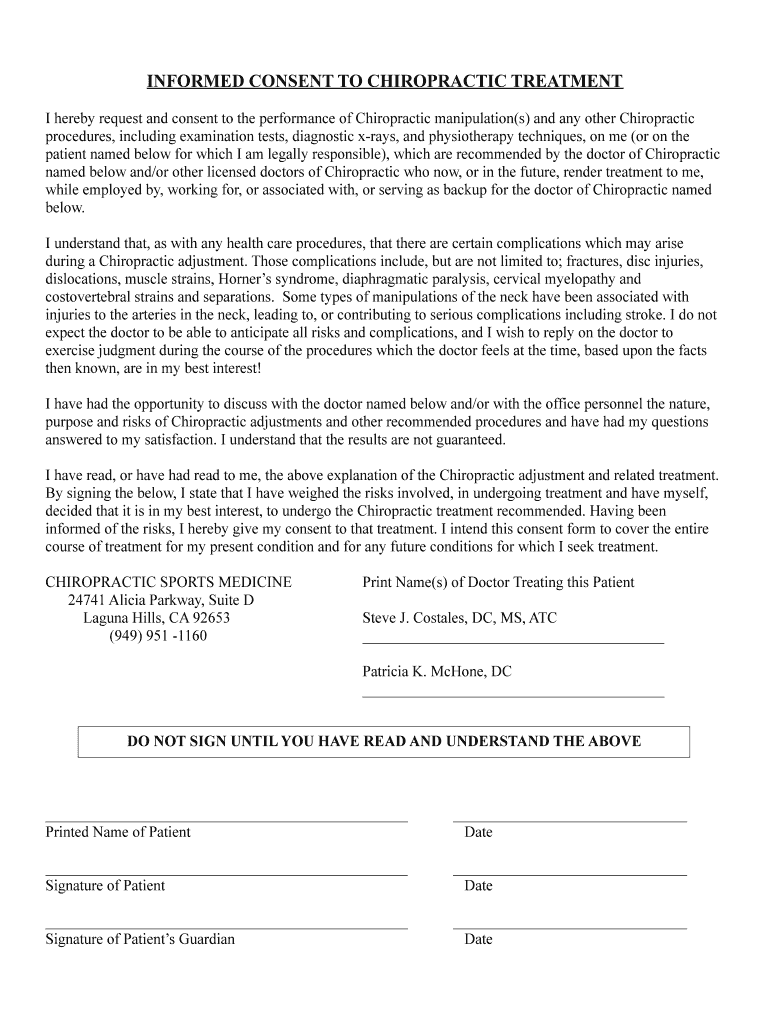 Get the free I hereby request and consent to the performance of Chiropractic manipulation(s) and ...