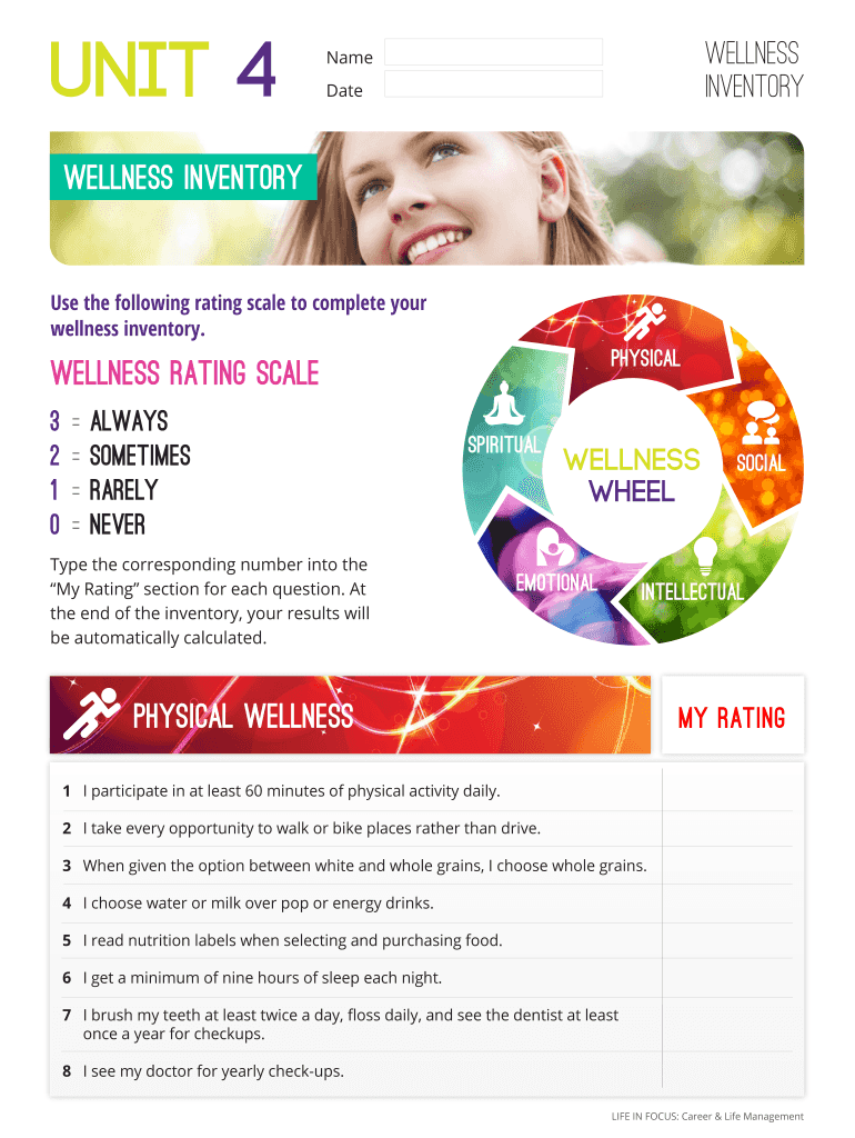 UNIT 4Wellness InventoryName DateWELLNESS Inventory the following rating scale to complete your wellness inventory.physicalWELLNESS RATING SCALE 3 2 1 0 Always Sometimes Rarely NeverspiritualType